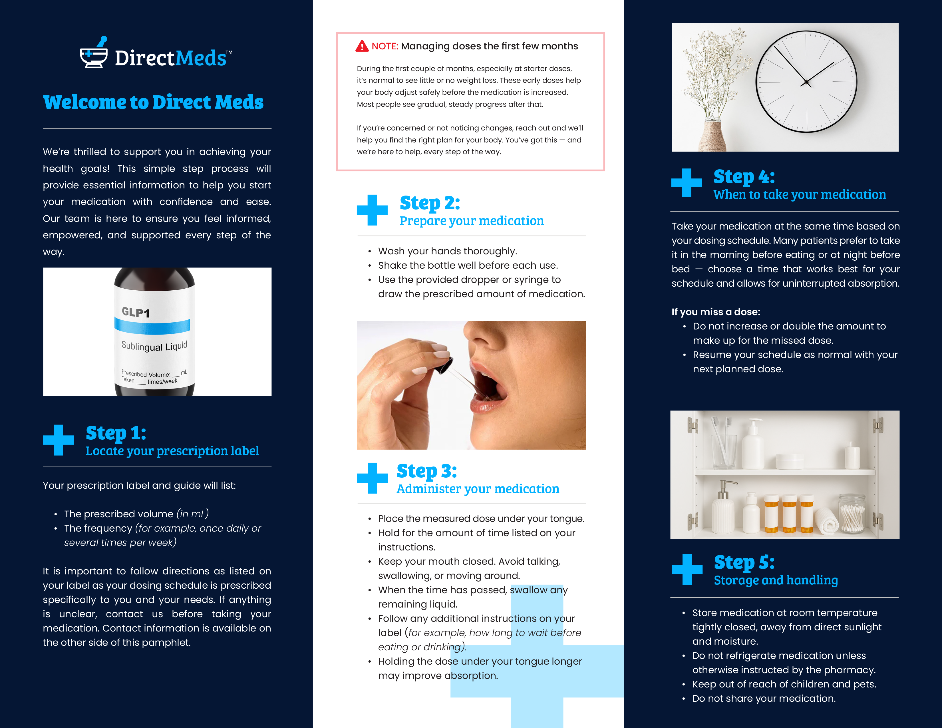 Included in your package is a guide outlining your specific dosage, the schedule you should follow, and when to increase the dose as directed by your doctor. Before preparing your medication, carefully read through this information to understand your dosing schedule.